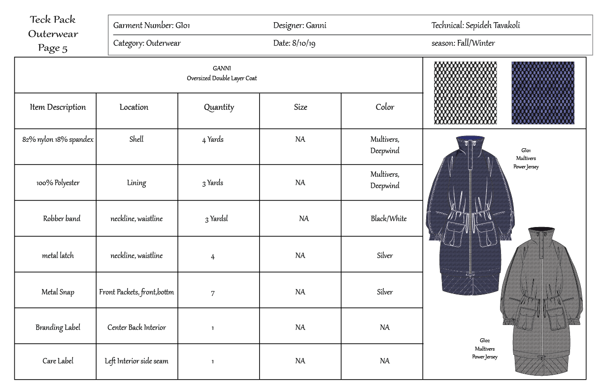 This is a self-directed project based on Gianni's 2019 collection. First, I created a tech pack Adding details and notes. Additionally, to make it more interesting, I decided to change the fabric variation with a Polkadot.